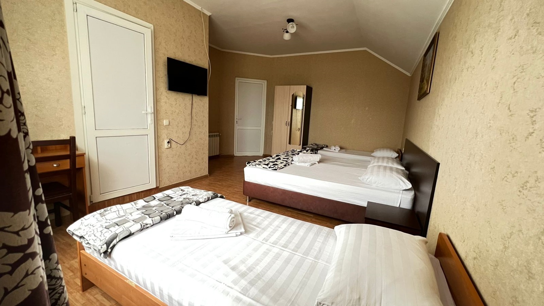 - Мебель: зеркало, кровати односпальные /одна двуспальная кровать, прикроватные тумбочки, шкаф